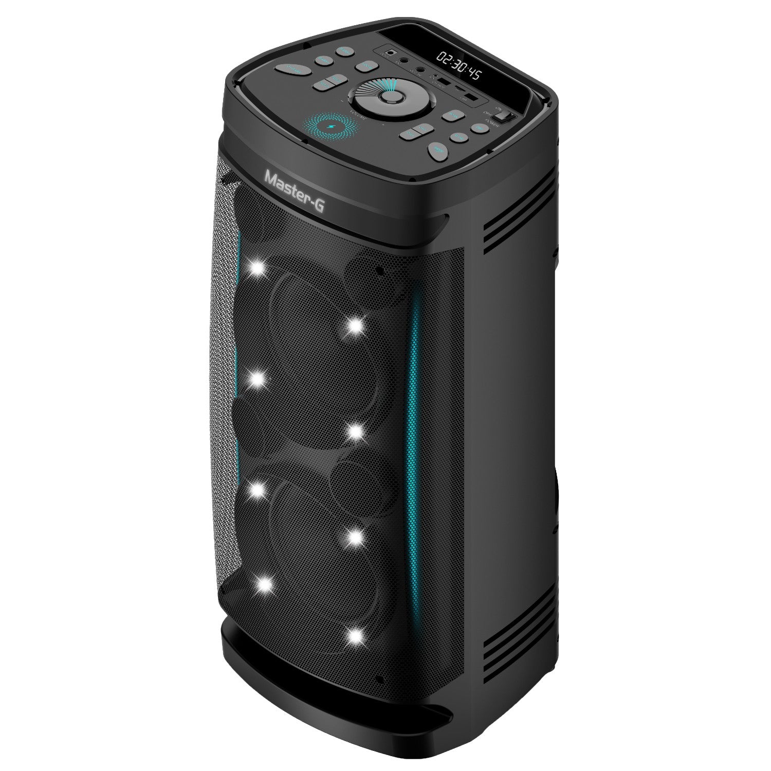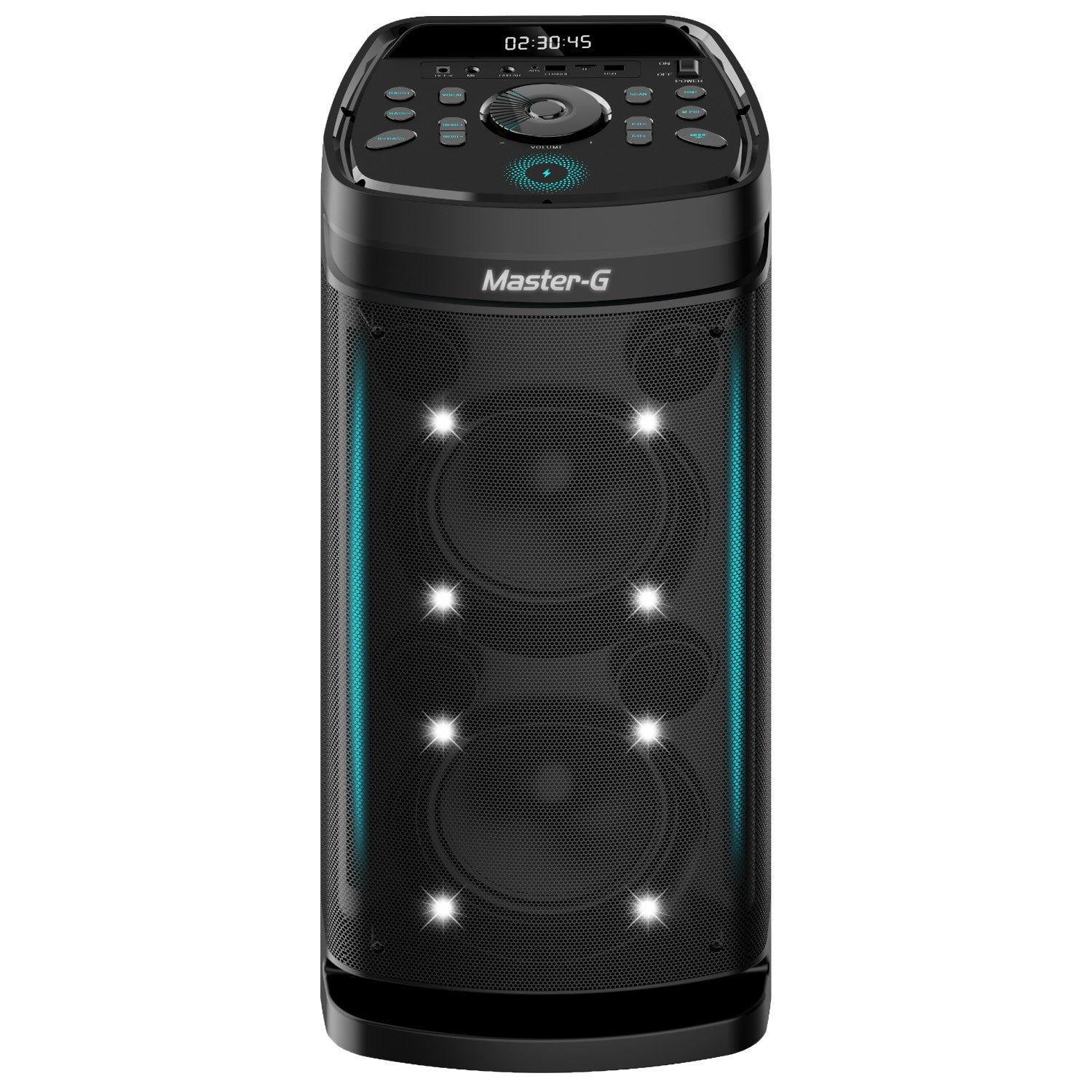 Karaoke Date el gusto de sentirte una estrella. Con los Parlantes Karaoke de Master-G canta todos esos éxitos junto a tus amigos. Con un sonido único y envolvente. Bluetooth Conecta todos tus dispositivos bluetooth a los Parlantes Karaoke Master-G para que reproduzcas tus temas favoritos de forma inalámbrica cuando quieras y donde quieras. Conexiones Nuestro parlante cuenta con puerto USB, Lector de tarjetas Micro SD y entrada auxiliar para que puedas ampliar tus posibilidades de escuchar tu música favorita de la manera más simple para ti Estéreo inalámbrico (TWS) Con la función TWS (True Wireless Stereo) podrás conectar dos parlantes del mismo modelo en forma simultánea y escuchar como si fuera un solo un equipo de música con el envolvente sonido estéreo Especificaciones Pantalla display LED Conectividad Bluetooth Función True Wireless Stereo (TWS) Superficie de Carga Inalámbrica Puerto USB para cargar dispositivos 5V Reproductor de MP3 Radio FM Función Karaoke Efecto de iluminación LED RGB Entrada auxiliar 2 Entradas de micrófono Puerto USB Lector tarjeta Micro SD Potencia: 16.000W P.M.P.O. Control de Tonos (Bajos y Agudos) y G-Bass Woofer: 8" x2 / Tweeter: 1,5” Batería Recargable Parlante profesional con rejilla de acero Incluye: Micrófono inalámbrico / Control remoto