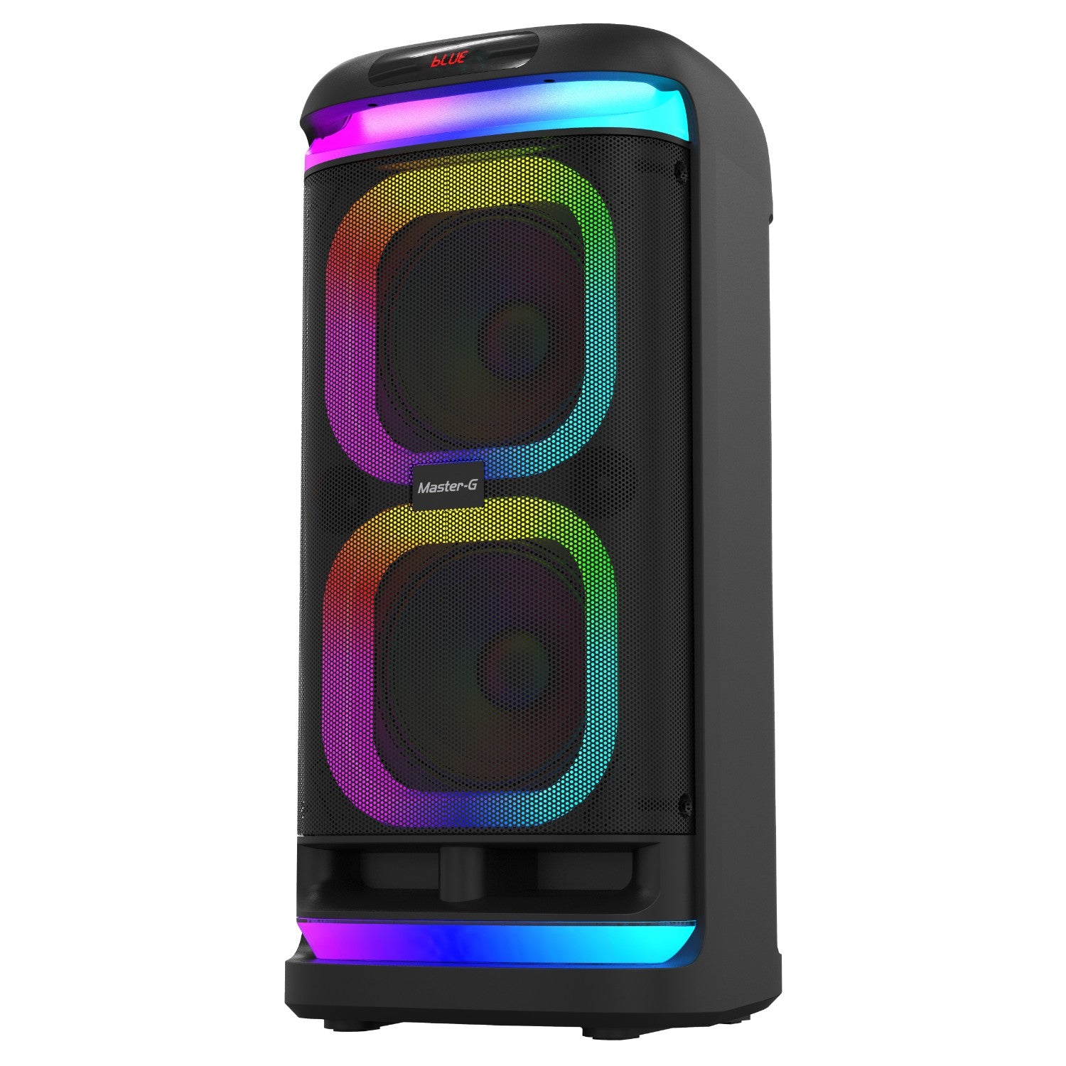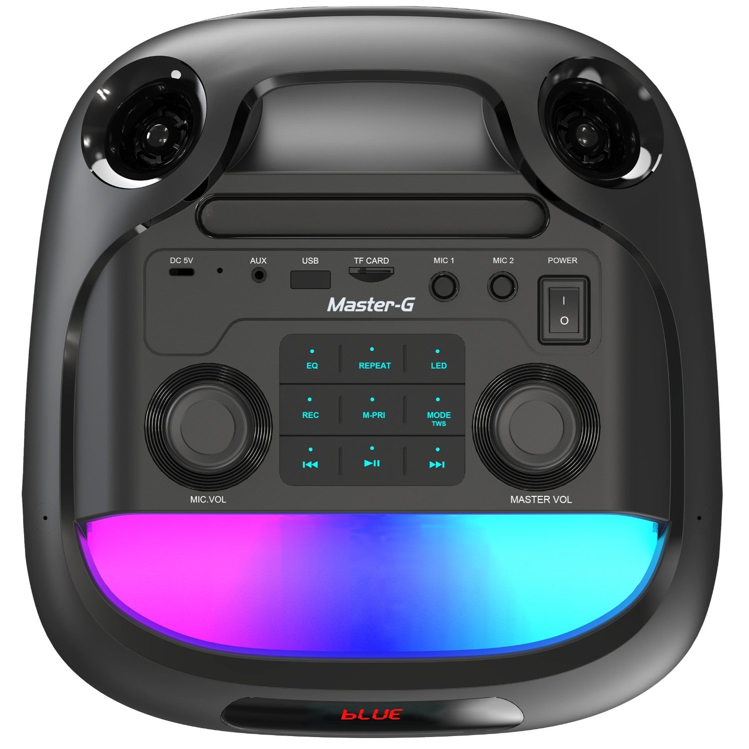 Karaoke Especificaciones Date el gusto de sentirte una estrella. Con los Parlantes Karaoke de Master-G canta todos esos éxitos junto a tus amigos. Con un sonido único y envolvente. Bluetooth 5.3 Conecta todos tus dispositivos bluetooth a los Parlantes Karaoke Master-G para que reproduzcas tus temas favoritos cuando quieras y donde quieras. Conexiones Nuestro parlante cuenta con puerto USB, entrada auxiliar y tarjetas Micro SD para que puedas ampliar tus posibilidades de escuchar tu música favorita de la manera más simple para ti. Estéreo inalámbrico (TWS) Con la función TWS (True Wireless Stereo) podrás conectar dos parlantes del mismo modelo en forma simultánea y escuchar como si fuera un solo equipo de música con el envolvente sonido estéreo. - Pantalla display LED - Conectividad Bluetooth 5.3 - Función True Wireless Stereo (TWS) - Reproductor de MP3 - Radio FM - Función Karaoke - Parlante con efecto de iluminación LED - Entrada auxiliar - Entrada de micrófono x2 - Puerto USB - Slot Micro SD - Potencia máxima: 12.000W P.M.P.O. (40 W RMS) - Woofer: 6,5 pulgadas x2 - Ecualizador preestablecido - Puerto de carga USB Tipo-C 5V 2A - Batería recargable incorporada 7,4V/4000mAh - Parlante profesional con rejilla de acero - Incluye: Micrófono alámbrico, Control remoto Producto Caja Medidas: 565 x 258 x 250 mm Peso: -- Kg. Medidas: 650 x 301 x 287 mm Peso: -- Kg