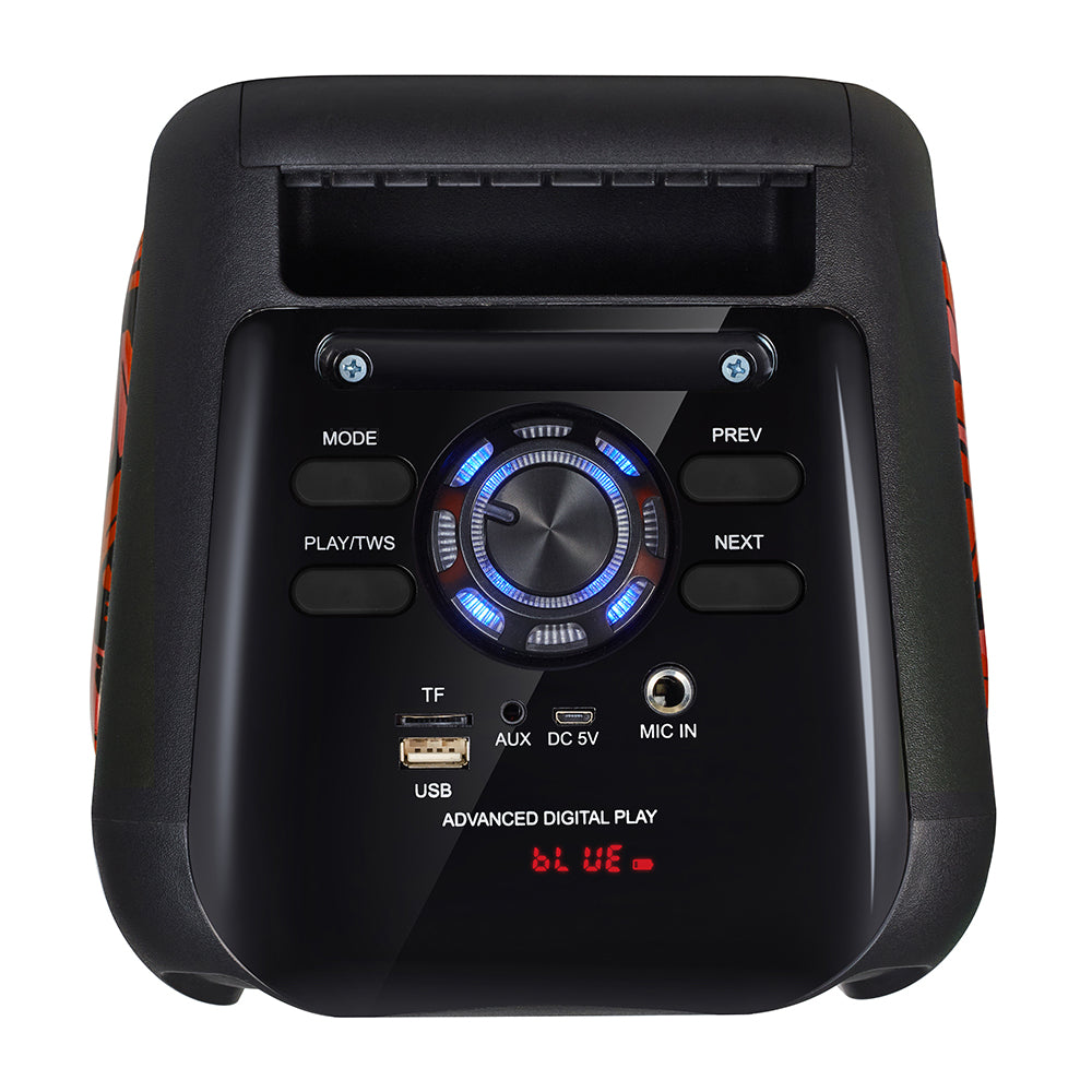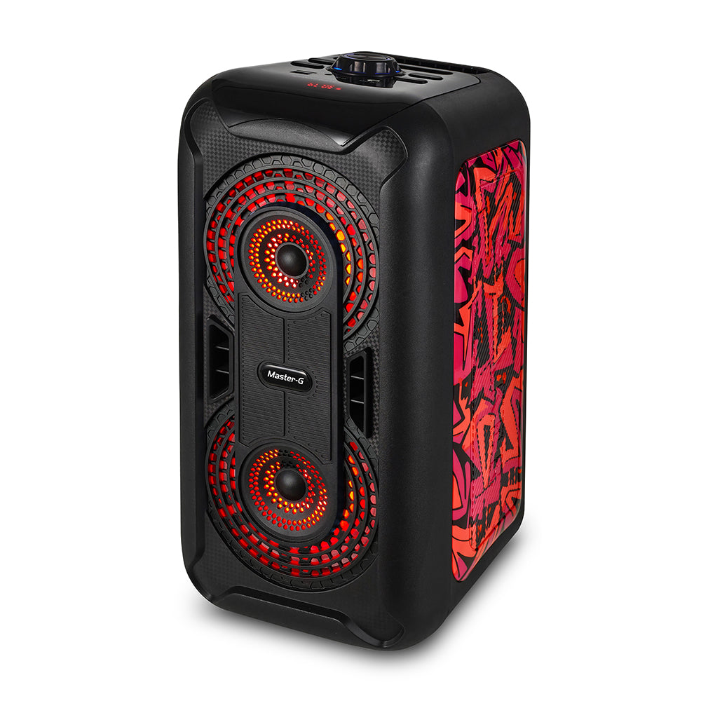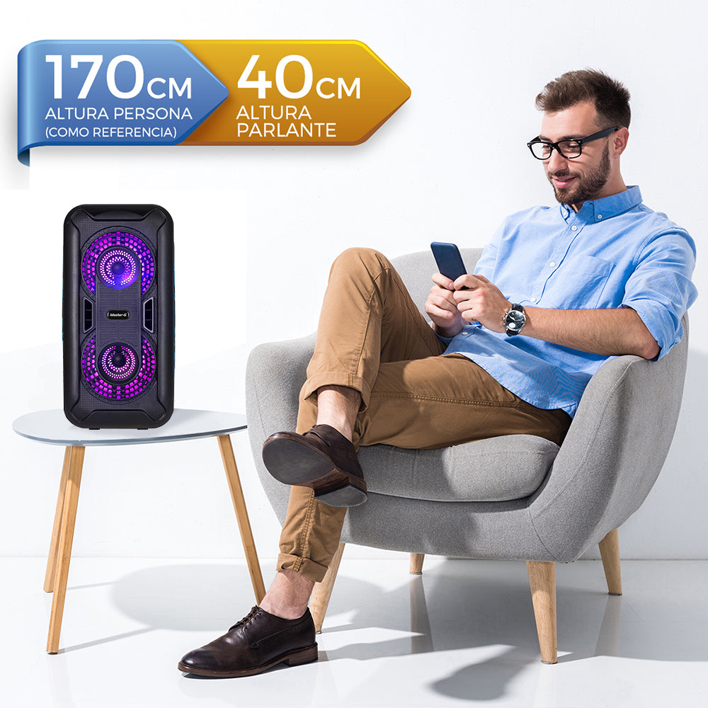 Nuevo MGEXPEDITION de Master-G es perfecto para fiestas de karaoke e ideal como un pequeño sistema de sonido. Puedes conectar directamente tu celular, o cualquier dispositivo bluetooth para reproducir música sin necesidad de cables. Una poderosa batería de 2400mAh entrega hasta 4 horas de funcionamiento ininterrumpido, lo que permite una gran autonomía de uso, para que nunca te quedes sin música de forma inesperada. Este parlante está equipado en lector de tarjetas microSD y lector USB, para que puedas conectar tarjetas o pendrives con tus listas de reproducción favoritas. Esto lo convierte en un completo y multifuncional sistema de sonido. En su parte superior, el parlante incorpora un práctico panel de control donde se encuentran todas las entradas y lectores, además de todos los botones de reproducción necesarios para adelantar, retroceder y poner play / pausa a la música. El panel LED te permite ver la entrada seleccionada para reproducción. También cuenta con función de radio FM, con la que podrás dejar presintonizadas tus radios favoritas. El parlante está equipado con 2 altavoces de 6,5 pulgadas de diámetro, que entregan un sonido potente y de buena calidad. En el panel de control, también podrás encontrar una entrada de micrófono plug de 6,5mm y una entrada auxiliar miniplug de 3,5mm. Así podrás conectar micrófonos y también reproductores de música que no cuenten con conexión bluetooth. Además, incluye un Micrófono Alámbrico, para que puedas sacar el máximo provecho en cualquier momento. También incorpora Control Remoto para controlar a distancia las opciones de encendido, adelantar, retroceder , poner play y pausar a la música. De esta forma podrás sacar el máximo provecho en tus karaokes o presentaciones. Características: • Parlante: 6,5" rango completo x2 • Potencia: 20W RMS / 4.000W P.M.P.O. • Conectividad Bluetooth • Reproductor de MP3 • Radio FM • Entrada Auxiliar (3,5mm) • Entrada Micrófono • Control de volumen electrónico • Pantalla display LED • Función Karaoke • Slot Tarjeta Micro SD • Puerto USB • Carga Micro USB 5V • Batería Recargable Integrada 3.7V / 2400mA • Efecto de iluminación led • Manilla • Medidas (Ancho x Alto x Prof.): 19,0 x 40,0 x 19,0 cm • Peso : 3,13 Kg. • Incluye: • Micrófono alámbrico • Cable USB (carga 5V 1A) • Manual de Usuario