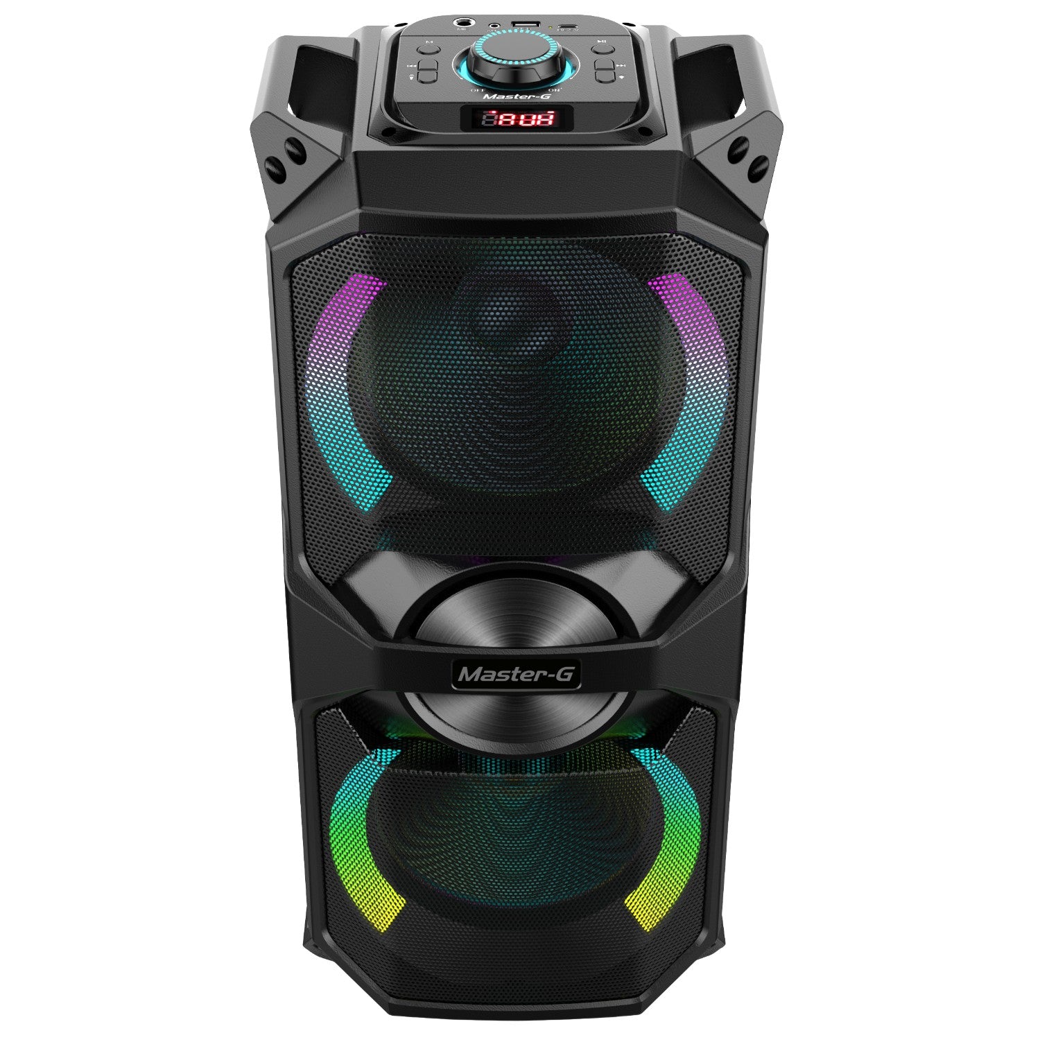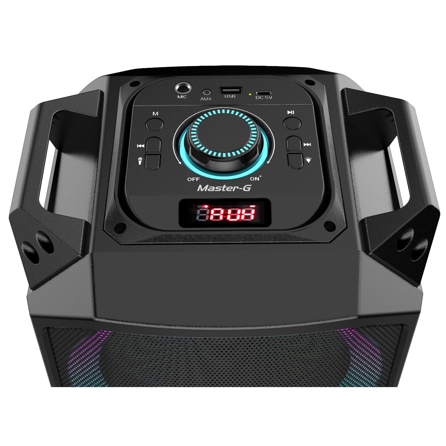 Karaoke Date el gusto de sentirte una estrella. Con los Parlantes Karaoke de Master-G canta todos esos éxitos junto a tus amigos. Con un sonido único y envolvente. Bluetooth 5.3 Conecta todos tus dispositivos bluetooth a los Parlantes Karaoke Master-G para que reproduzcas tus temas favoritos cuando quieras y donde quieras. Conexiones Nuestro parlante cuenta con puerto USB y entrada auxiliar para que puedas ampliar tus posibilidades de escuchar tu música favorita de la manera más simple para ti. Estéreo inalámbrico (TWS) Con la función TWS (True Wireless Stereo) podrás conectar dos parlantes del mismo modelo en forma simultánea y escuchar como si fuera un solo equipo de música con el envolvente sonido estéreo. Especificaciones: "- Pantalla display LED - Conectividad Bluetooth 5.3 - Función True Wireless Stereo (TWS) - Reproductor de MP3 - Radio FM - Función Karaoke - Parlante con efecto de iluminación LED - Entrada auxiliar - Entrada de micrófono - Puerto USB - Potencia máxima: 6.000W P.M.P.O. (20 W RMS) - Woofer: 6,5"" x2 - Ecualizador preestablecido - Puerto de carga USB Tipo-C 5V 2A - Batería recargable incorporada 3,7V/3000mAh - Parlante profesional con rejilla de acero - Incluye: Micrófono alámbrico, Control remoto" Producto Caja Medidas: 232 x 211 x 324 mm Peso: -- Kg. Medidas: 248 x 601 x 246 mm Peso: -- Kg