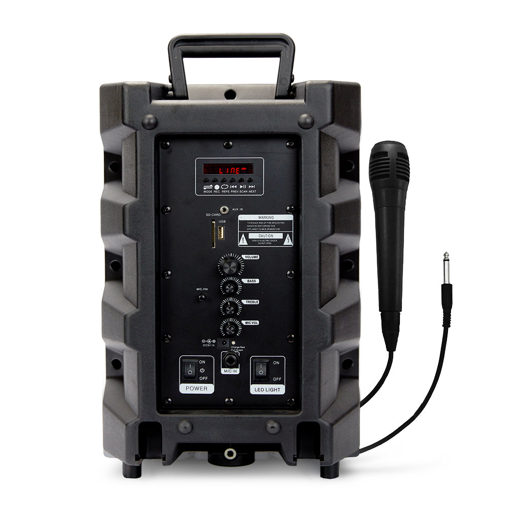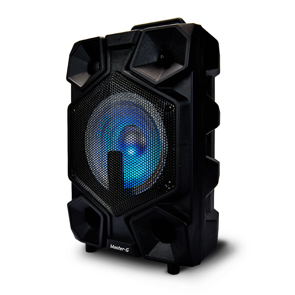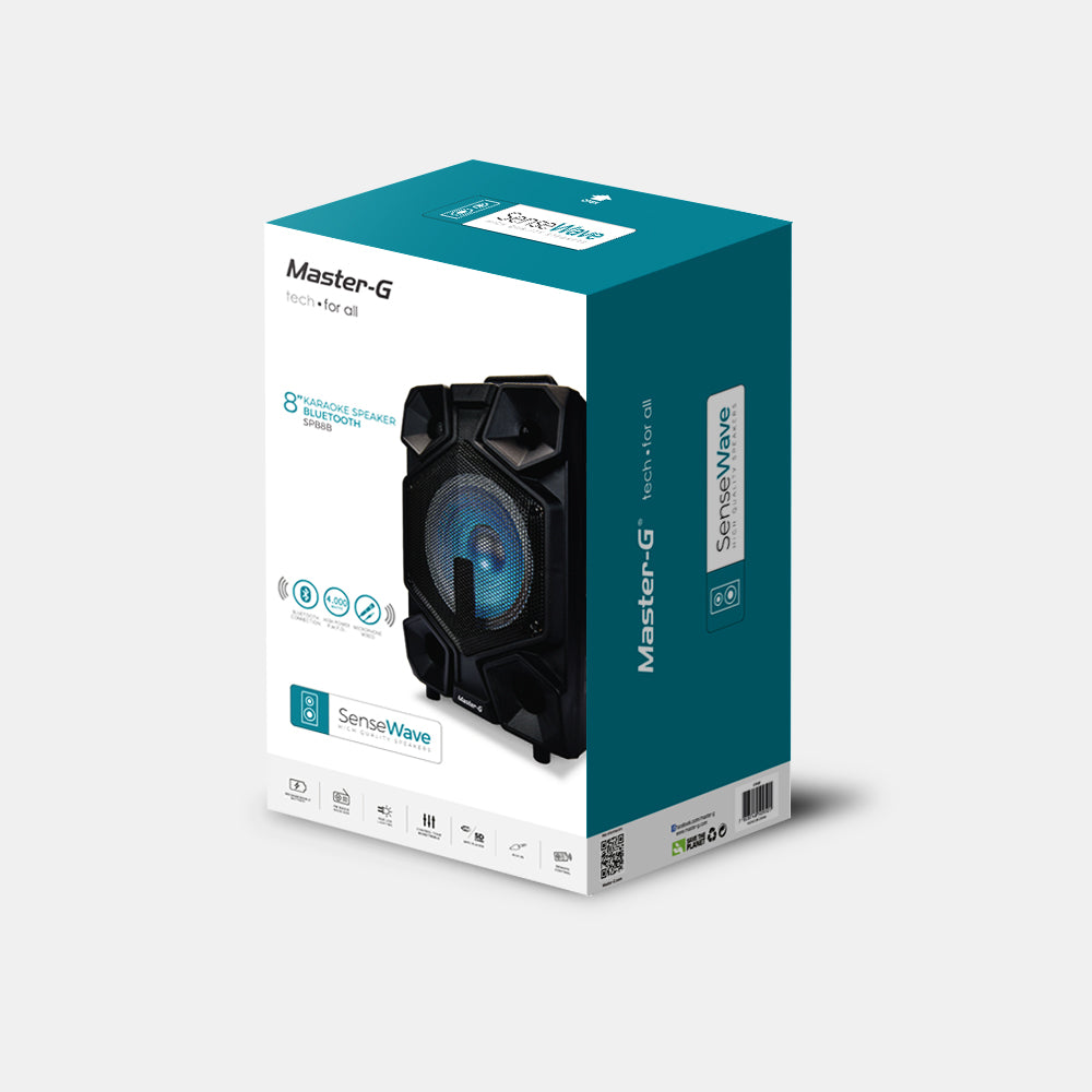 El parlante SPB8B de Master-G es perfecto para fiestas de Karaoke e ideal como un pequeño sistema de sonido. Puedes conectar directamente tu celular, o cualquier dispositivo Bluetooth para reproducir música sin necesidad de cables. Una poderosa Batería de 4000mAh entrega hasta 5 horas de funcionamiento ininterrumpido, lo que permite una gran autonomía de uso, para que nunca te quedes sin música de forma inesperada. Este parlante está equipado en Lector de Tarjetas microSD y lector USB, para que puedas conectar tarjetas o pendrives con tus listas de reproducción favoritas. Esto lo convierte en un completo y multifuncional sistema de sonido. En su parte trasera, el parlante incorpora un práctico Panel de Control donde se encuentran todas las entradas y lectores, además de todos los botones de reproducción necesarios para adelantar, retroceder y poner play / pausa a la música. El panel LED te permite ver la entrada seleccionada para reproducción. También cuenta con función de radio FM, con la que podrás dejar pre-sintonizadas tus radios favoritas. El parlante está equipado con 1 altavoz de 8 pulgadas de diámetro, que entrega un sonido potente y de buena calidad. En el panel de control, también podrás encontrar una entrada de micrófono plug de 6,5mm y una entrada auxiliar miniplug de 3,5mm. Así podrás conectar micrófonos y también reproductores de música que no cuenten con conexión bluetooth. Además, incluye un Micrófono Alámbrico, para que puedas sacar el máximo provecho en cualquier momento. También incorpora Control Remoto para controlar a distancia las opciones de encendido, adelantar, retroceder , poner play y pausar a la música. De esta forma podrás sacar el máximo provecho en tus karaokes o presentaciones. Características: * Potencia 20W RMS * Conectividad Bluetooth * Reproductor de MP3 * Radio FM * Función Karaoke * Entrada Auxiliar / Micrófono * Slot Tarjeta SD * Puerto USB * Batería Recargable Integrada * Efecto de iluminación led RGB * Parlante: 8 pulgadas Dimensiones: * Medidas (Ancho x Alto x Prof) 26,0 x 38,5 x 21,0 cm * Peso : 3,0 Kg. Incluye: * Micrófono alámbrico * Control Remoto * Adaptador de Corriente 220V * Manual de Usuario