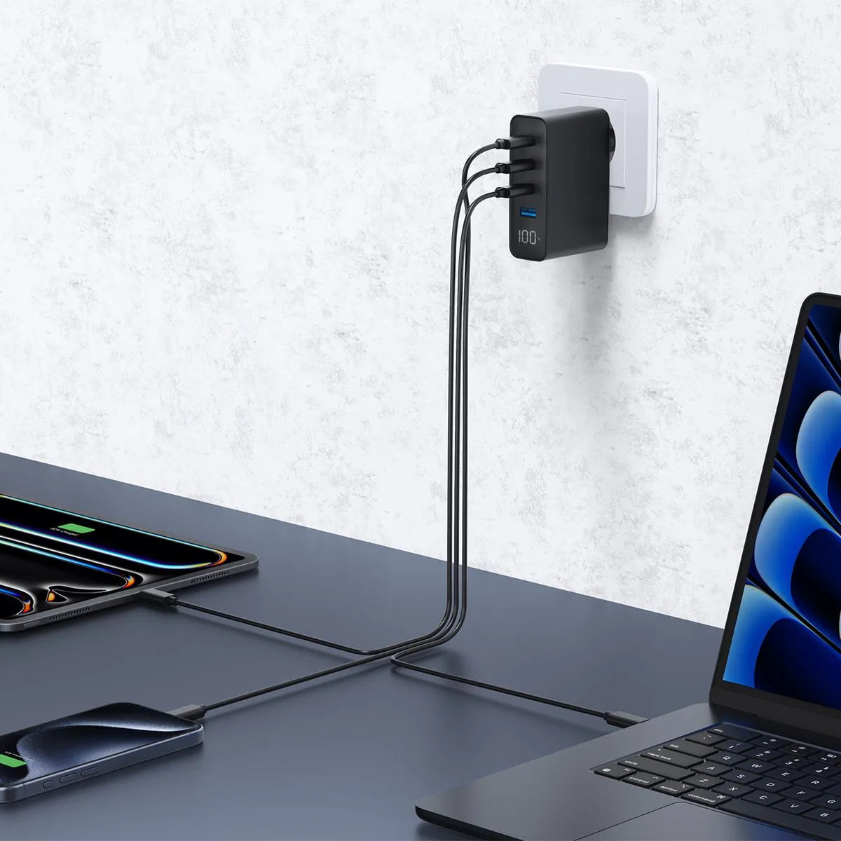 Incluye una pantalla digital LCD que muestra la potencia de carga en tiempo real. Con tres puertos USB - C y un puerto USB - A, permite cargar hasta cuatro dispositivos simultáneamente. Su sistema Power Delivery ofrece una carga hasta 4 veces más rápida que los cargadores convencionales.