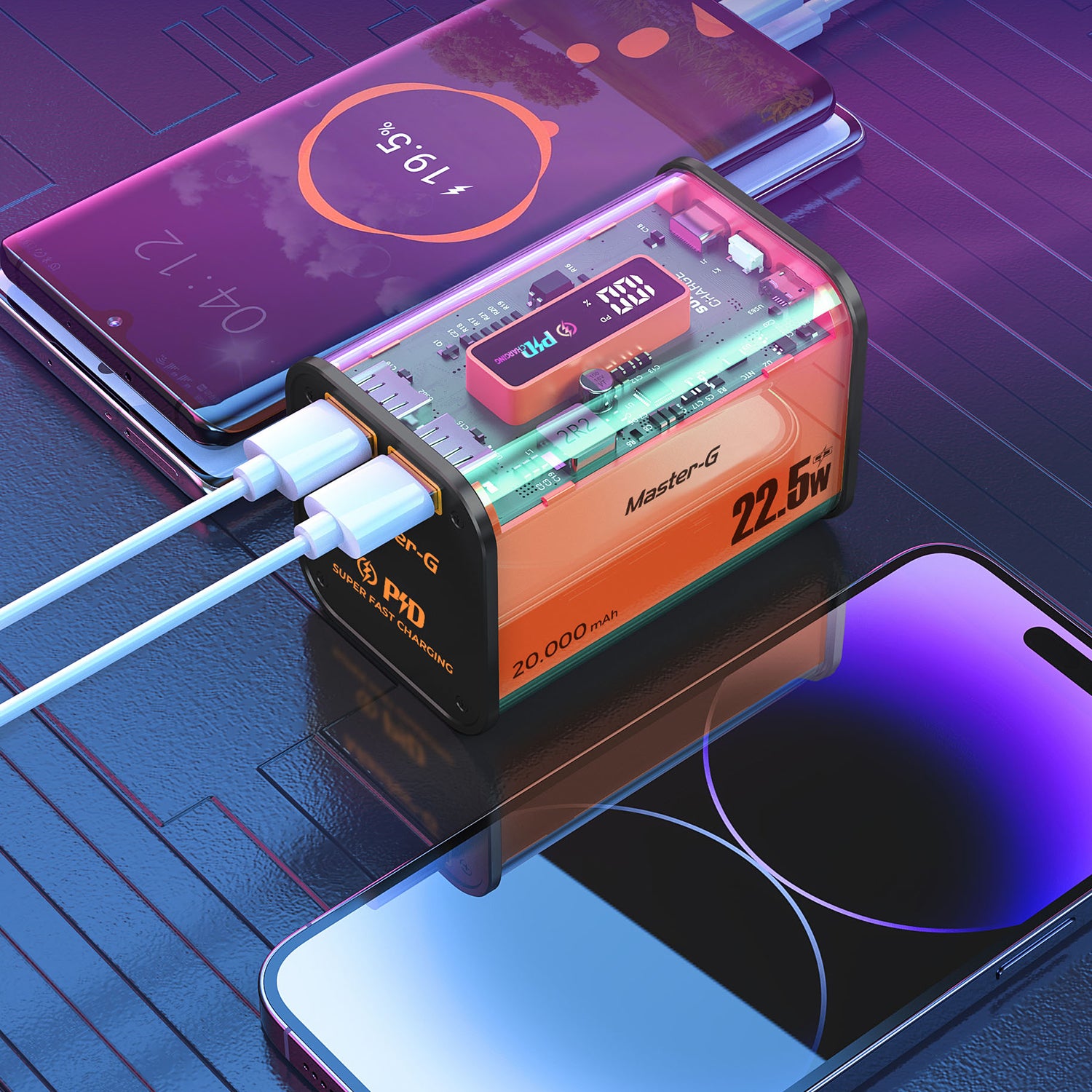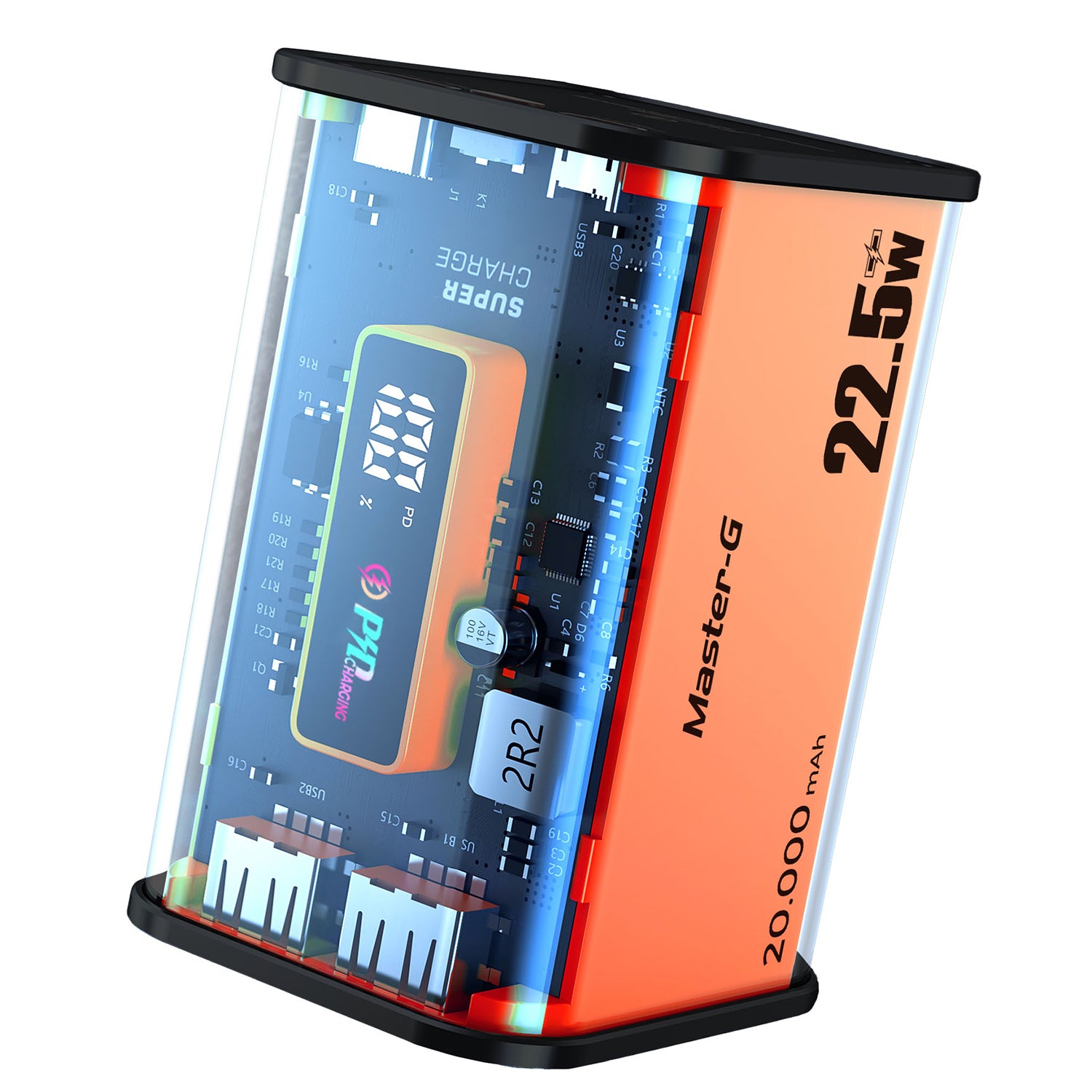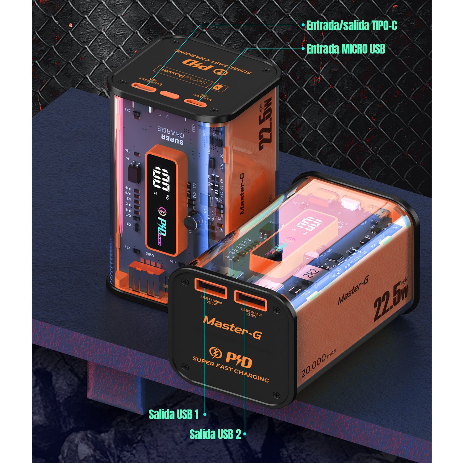 Más pequeño y cubierta transparente Su diseño compacto diseño de cubierta transparente con pantalla LCD y doble USB para cargar dos dispositivos al mismo tiempo. Más rápido Cargar tus dispositivos, mucho más rápido con su sistema 3A y sus puertos de carga Micro USB y Tipo C de 3ª Gran capacidad de carga El 1% no perdona, por eso lleva contigo tu cargador portátil Master-G, que con su moderno diseño y gran calidad, te entregan toda la energía que necesitan tus dispositivos de uso diario. Especificaciones: - Capacidad 20.000 mAh/37Wh - Pantalla LCD con Indicador de carga - Batería de polímero - Chip inteligente para optimizar la potencia de carga y descarga - Tamaño pequeño que cabe en la palma de tu mano - Entrada Micro USB 5V-3A / 9V-2A - Entrada Tipo C 5V-3A / 9V-2A / 12V-1.5A - Salida Tipo C 5V-3A / 9V-2.22A / 12V-1.67A - La interfaz Tipo-C admite carga rápida de 20 W y carga de teléfonos móviles de la serie iPhone 8-14. - 2 Salidas USB 4.5V-5A / 5V-3A / 9V-2A / 12V-1.5A - Compatibilidad con interfaz USB-A, protocolos FCP, SCP, VOOC y admite una potencia máxima de 22,5 W - Batería de Litio de alta calidad y potencia - Material a prueba de fuego ABS + PC y amigables con el medio ambiente - Temperatura de funcionamiento: -10°C a 40°C Medidas: 86 x 60 x 53 mm Peso: 0,5 Medidas (Ancho x Alto x Prof.) y pesos aproximados