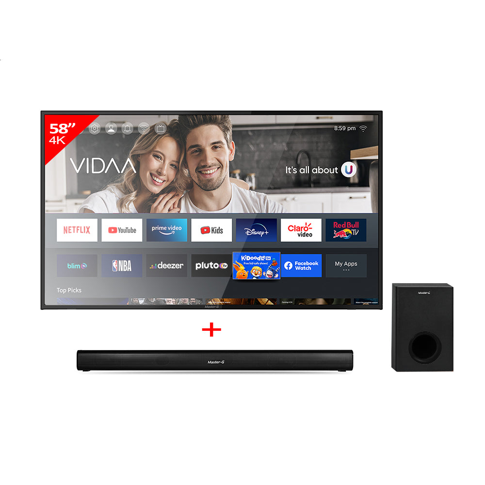 Smart TV Led 58" 4K Bluetooth MGV58 + Soundbar Mgsb211 Master-G Más que un cine. Nuestra línea Led SMART TV de Master-G trae incorporado sistema operativo VIDAA, incluye barra de sonido MGSB211 para brindarte la mejor experiencia Audiovisual y conectividad al momento de ver tus películas y series favoritas. Llénate de nuevas experiencias. Vibra con sus colores al momento de ver tus contenidos favoritos o simplemente conecta tu consola de videojuegos para elevar al máximo tus sentidos. No necesitas hacer absolutamente nada. El sistema operativo de nuestra línea de LED TV VIDAA es auto actualizable, solo debes sentarte a disfrutar la máxima experiencia, porque MGV58 hará todo por tí. El control remoto, tiene 6 accesos directos a tus App’s favoritas. Y por si fuera poco, puedes manejar todo desde tu SmartPhone, con Smart Remote te simplicamos la VIDAA. ART WORLD Disfruta más de 350 millones de pinturas de tus artistas favoritos, donde puedes congurar y dejar las que quieras como protectores de pantalla, mientras no estes disfrutando todo el contenido que te ofrece nuestra línea de LED Master-G. Especificaciones: · Pantalla: 58" Ultra HD · Resolución: 3840x2160 · Conectividad Bluetooth · Sintonizador Digital ISDB-T · Función SMART TV · WIFI Incluido · Trinorma: NTSC / PAL-N / PAL-M · Canales: ATV 193 / DTV 63 · Brillo: 250 cd/m2 · Contraste: 3000:1 · USB: 2 · Entrada HDMI: 3 · Entrada de A/V: 1 · Conector LAN · Conector Digital Optico · Potencia: 16W · Control Remoto · Incluye Soundbar Mgsb211 de Master-G Medidas (ancho / alto / profundidad ): 13 x 81,3 x 24,6 cm / Peso: 14,5Kg